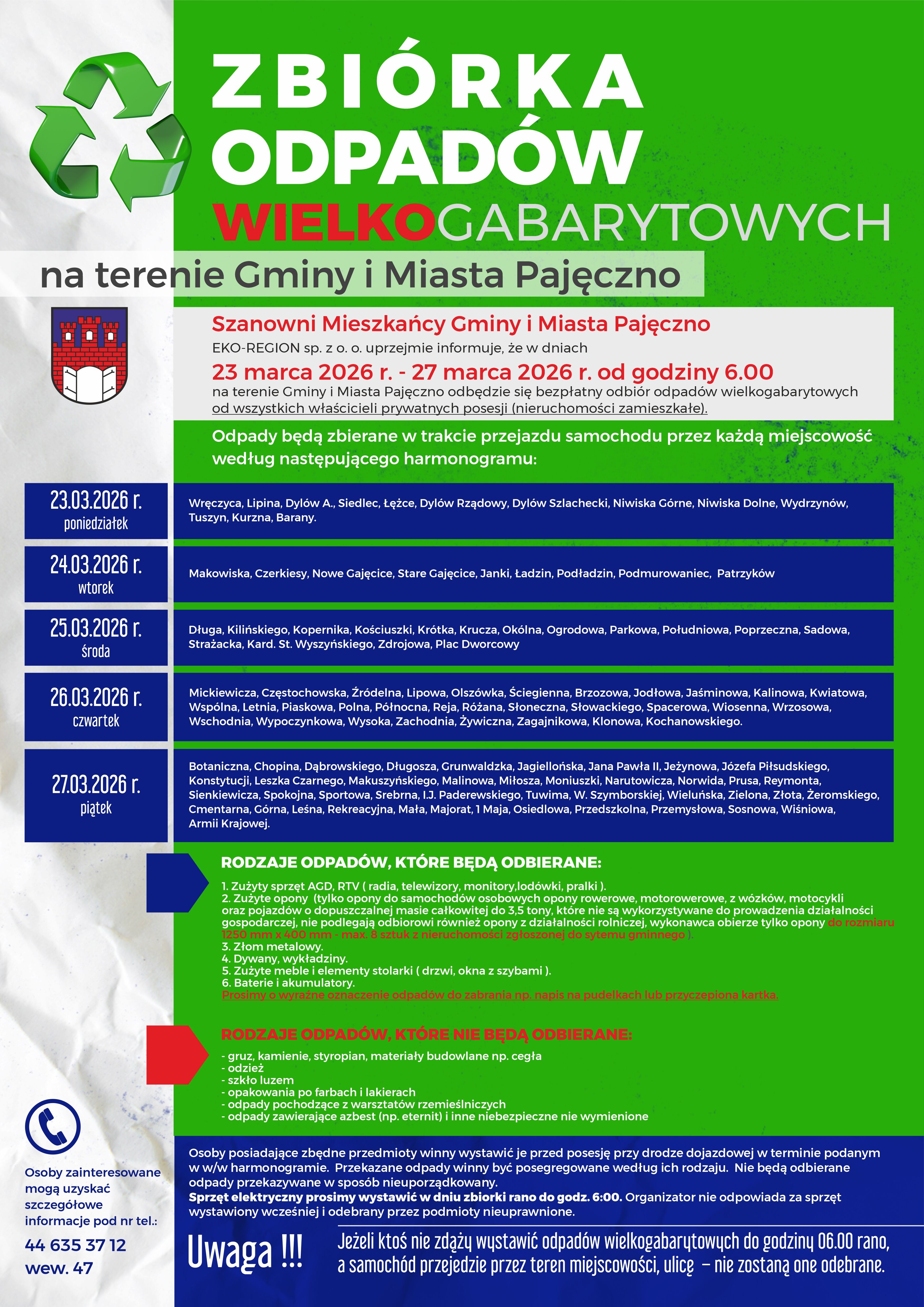 EKO-REGION sp. z o. o. uprzejmie informuje, że w dniach 23.03.2026 r. - 27.03.2026 r. od godziny 6.00 na terenie Gminy i Miasta Pajęczno odbędzie się bezpłatny odbiór odpadów wielkogabarytowych od wszystkich właścicieli prywatnych posesji (nieruchomości zamieszkałe). Odpady będą zbierane w trakcie przejazdu samochodu przez każdą miejscowość według następującego harmonogramu: